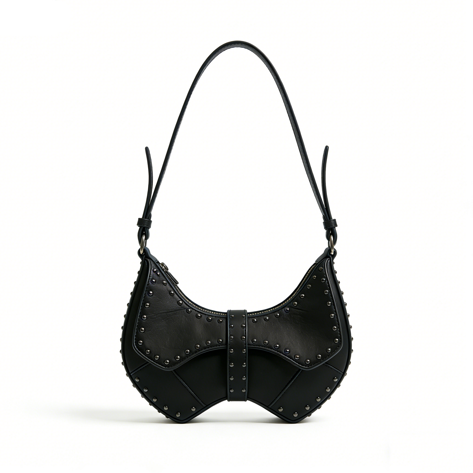 Elevate your rebel-chic style with this Black Studded Bow Shoulder Bag. Expertly constructed from high-quality black leather, it boasts a unique 3D bow silhouette and all-over silver stud embellishments that deliver unmissable punk flair. The adjustable leather shoulder strap offers versatile, comfortable carry, and the secure interior compartment easily holds your phone, wallet, and lip gloss. Designed for fashion-forward women, this bag seamlessly transitions from date nights and concerts to casual outings, adding a bold, feminine edge to any outfit. Durable hardware and premium leather ensure long-lasting wear for years of stylish use.