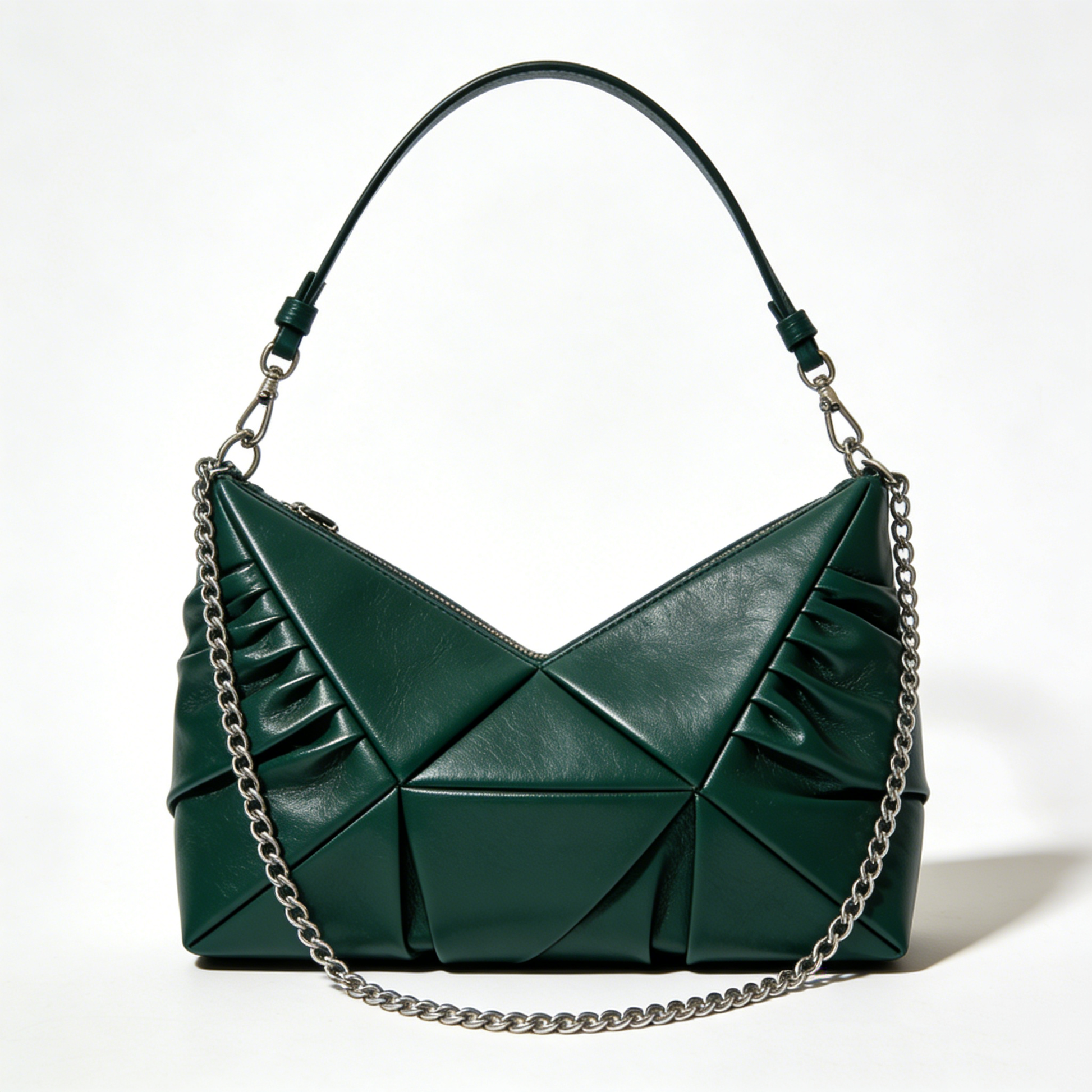 This Dark Green Geometric Pleated Underarm Bag is a perfect fusion of modern art and minimalist fashion. Crafted from premium smooth leather, it features a unique 3D geometric stitching design and delicate ruched details on both sides, creating a distinctive visual texture that stands out from ordinary bags.