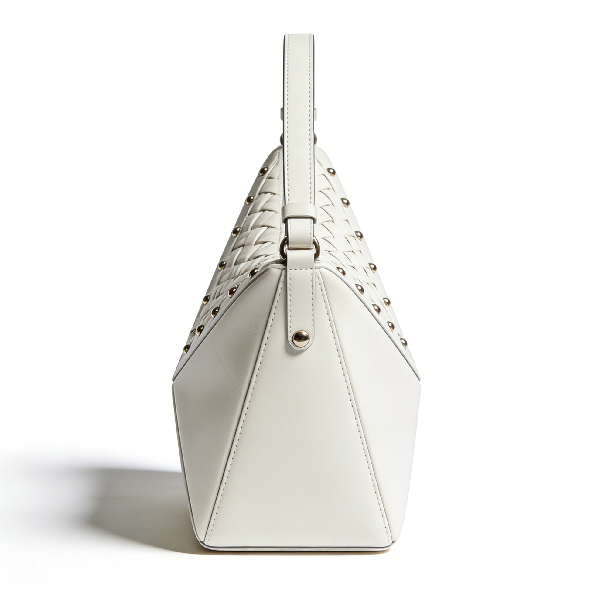 This Geometric Woven Studded Shoulder Bag redefines modern minimalism with its bold, angular silhouette. Crafted from smooth, premium faux leather, it features a striking woven panel detail, accented by polished metal studs for an edgy, contemporary touch.