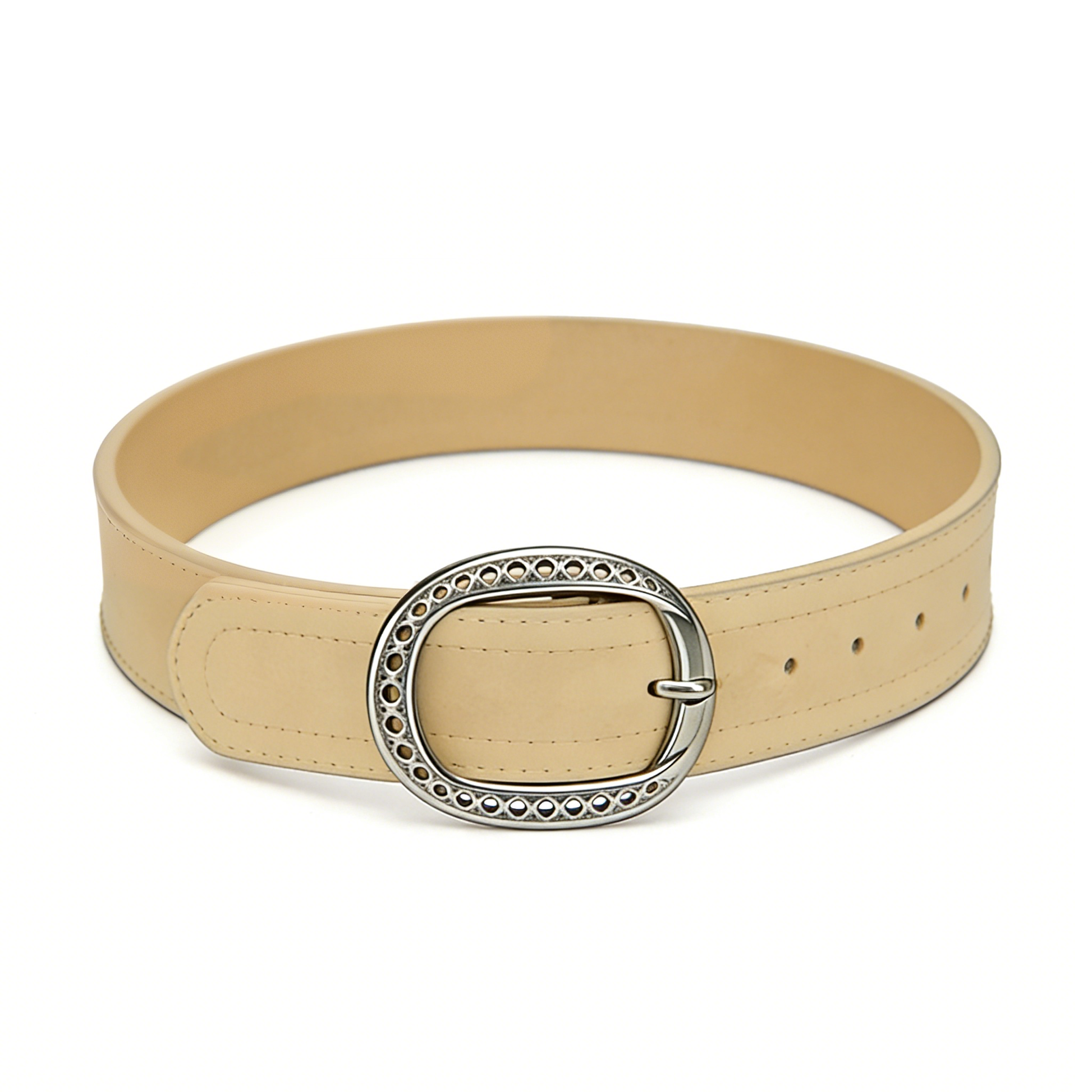 This oval buckle beige leather belt brings a touch of understated elegance to any outfit. Crafted from smooth, high-quality beige leather, it features a distinctive oval metal buckle with a hollow, openwork design that adds subtle visual interest. The adjustable holes ensure a comfortable, customized fit for most waist sizes, while the clean stitching enhances its refined look. Perfect for pairing with dresses, blouses, jeans, or tailored trousers, it effortlessly elevates both casual and semi-formal looks, making it a versatile staple for your wardrobe.